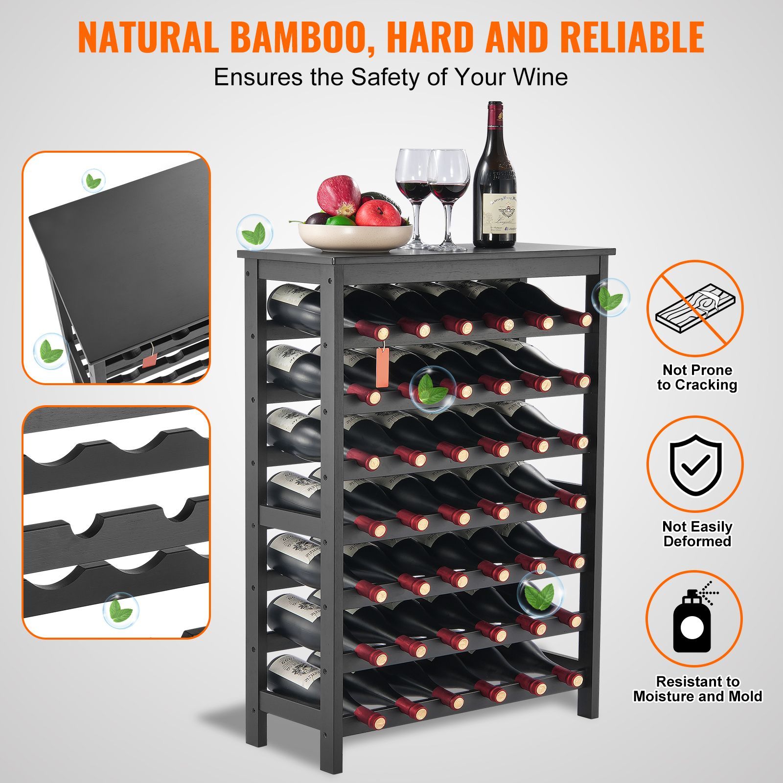 4.Natural Bamboo Wood: Our wine storage rack is made from high-quality bamboo, which is smooth, crack-resistant, and less likely to absorb moisture or mold. The natural bamboo has excellent resilience and supports wine bottles perfectly without wobbling.